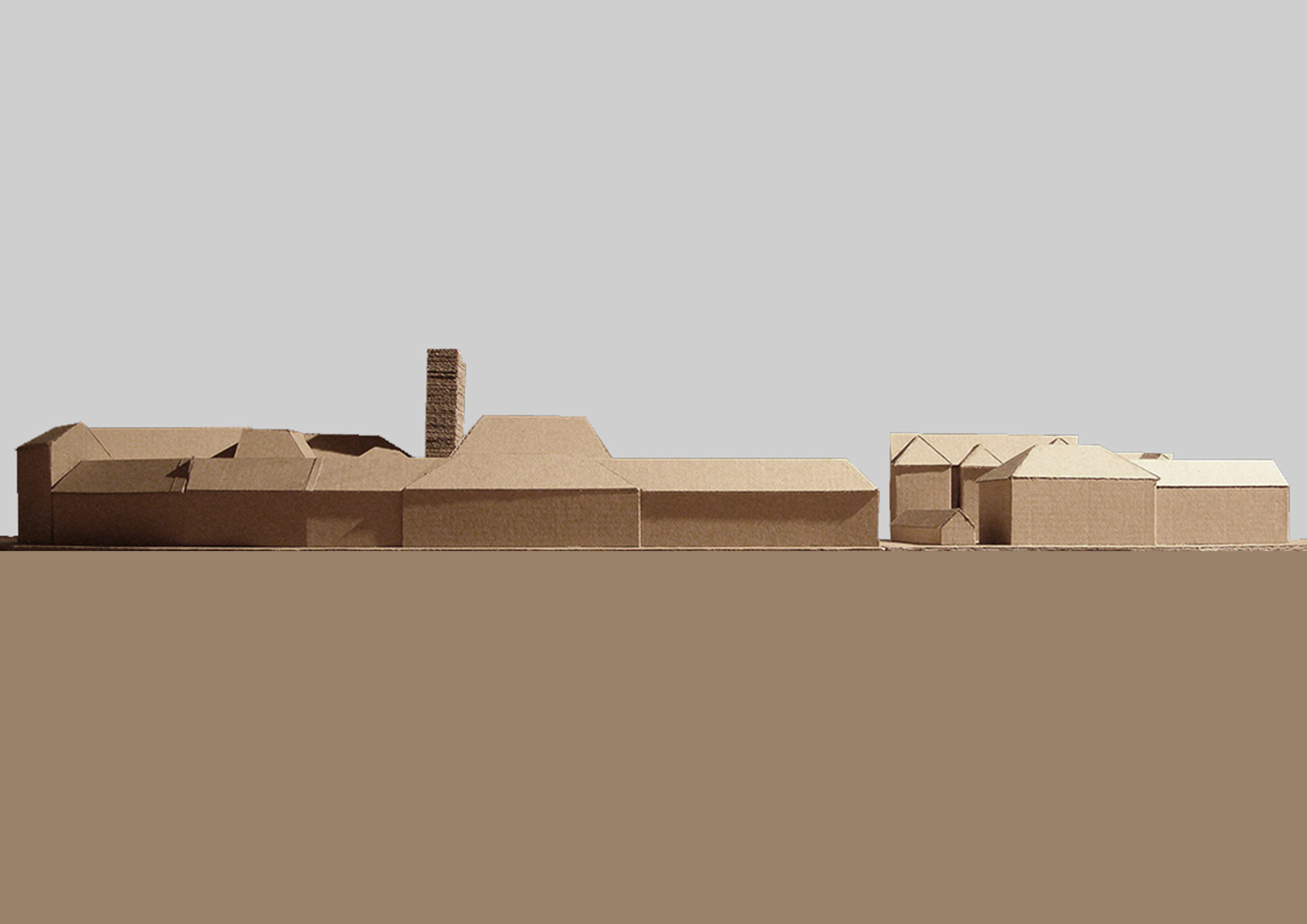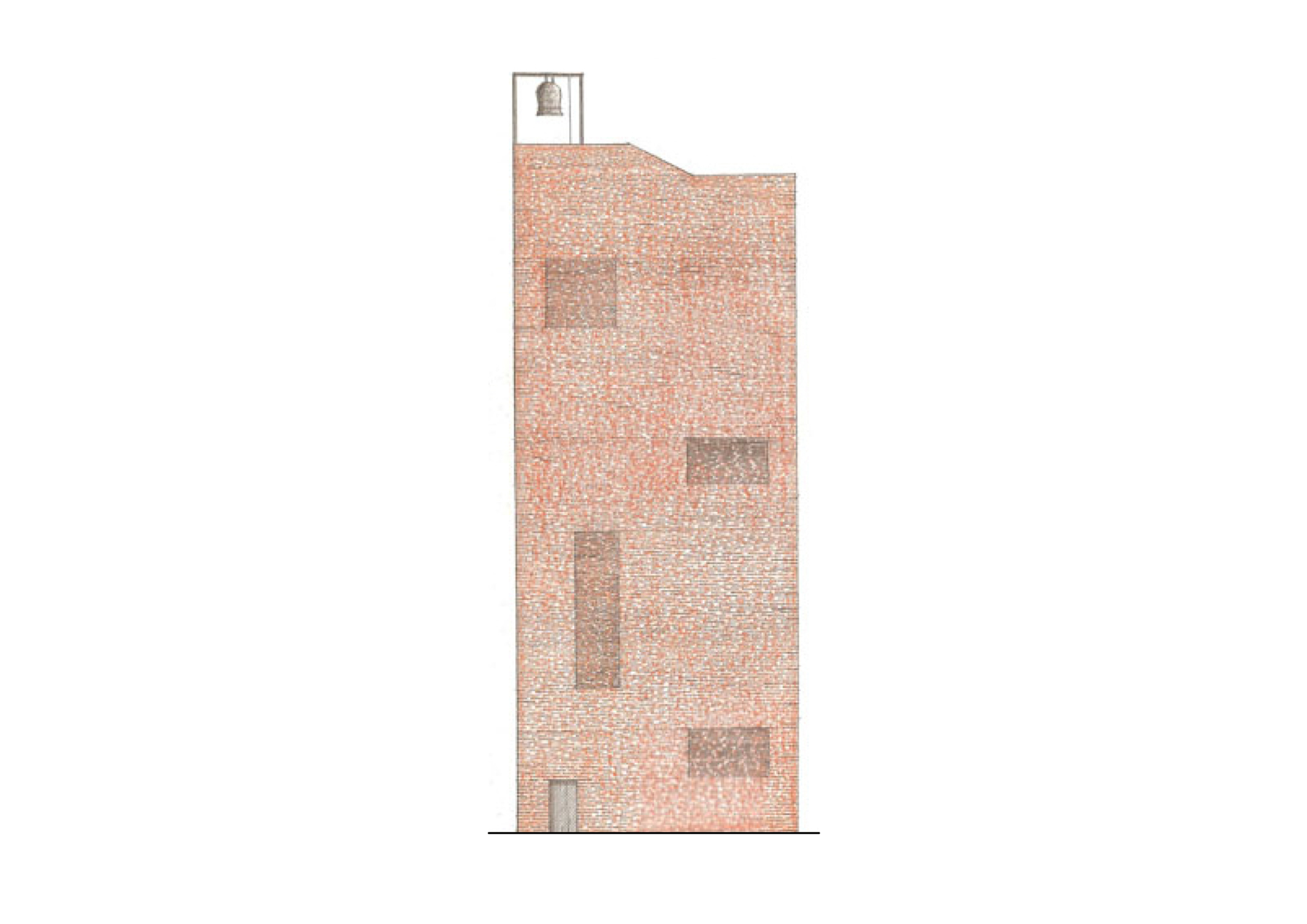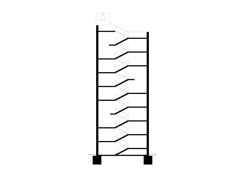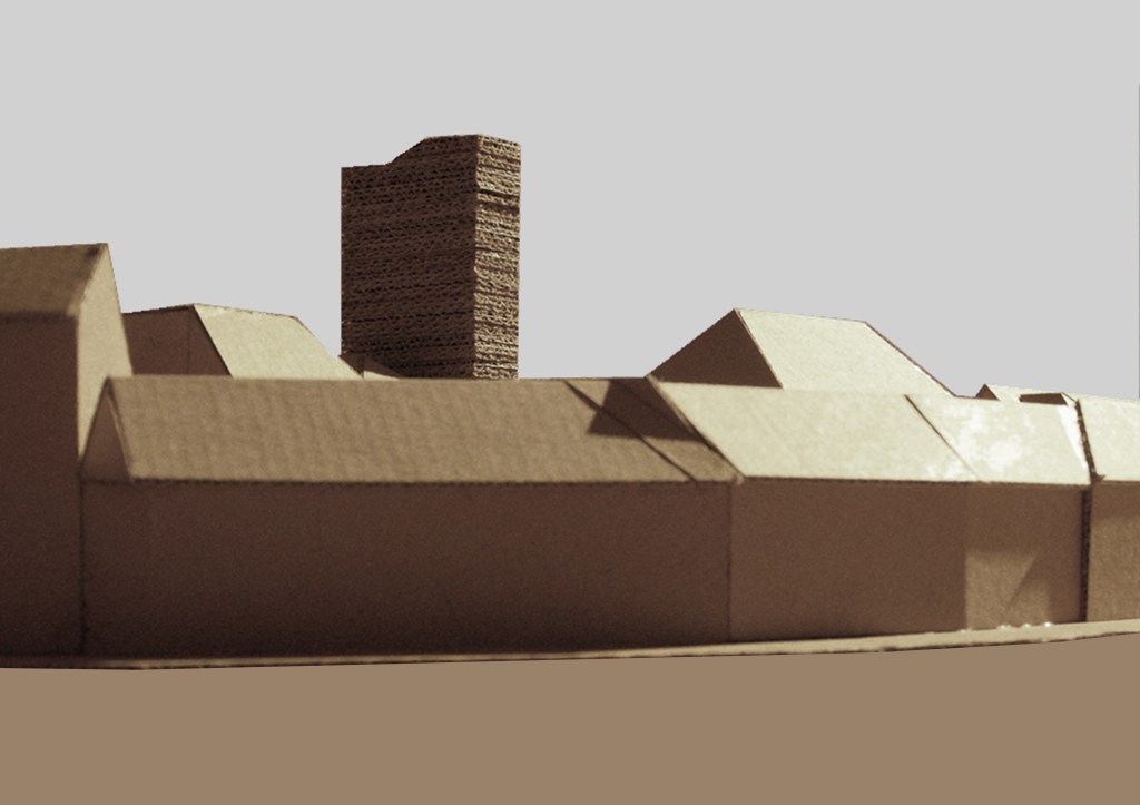 The proposal placed the belfry between the Lutheran high school and the church to fill the empty space between them. In a way like this, the tower can close the courtyard and separate the church garden and make the undefined spacial relationship more exact. The belfry would be a vertical sign in the claster of the “Lutheran Island” (the so called Insula Lutherana) and in the inner spaces a vertical Lutheran museum was taken place. From the roof top terrace there is a nice view to the old town of Győr. The main material of the tower is brick, because brick can reflect to the roof tiles of the big roof. Light comes into the spaces through the partly perforatedly built brick facade.
