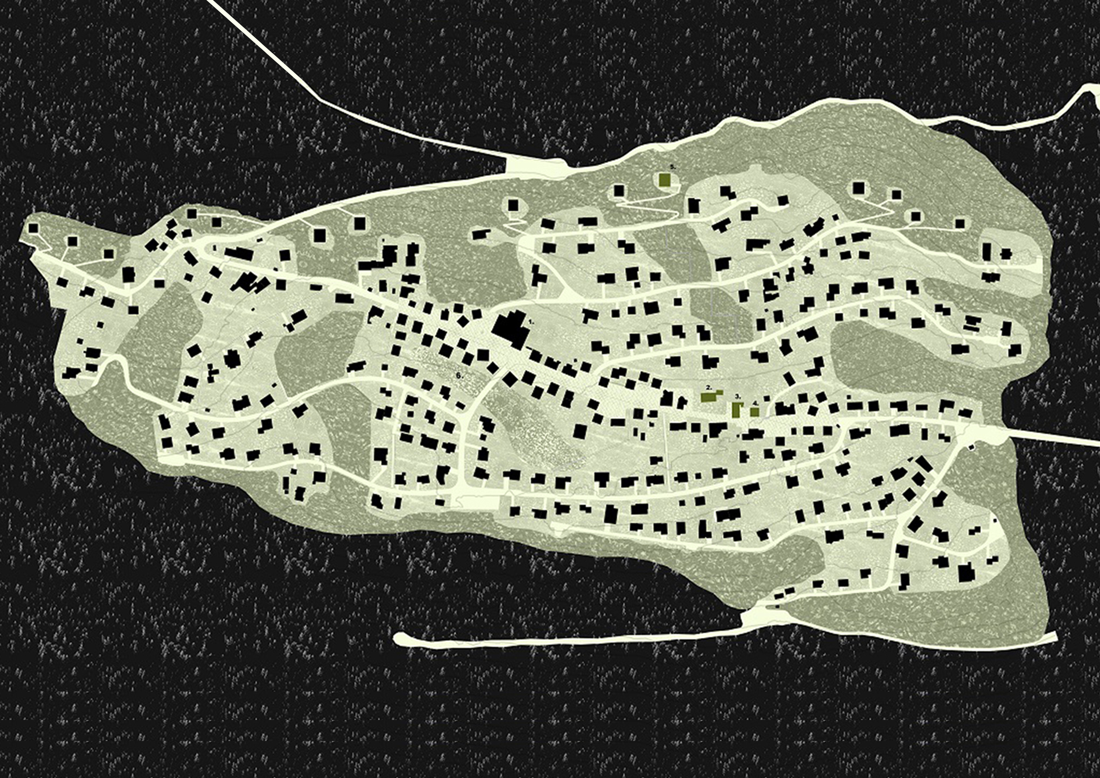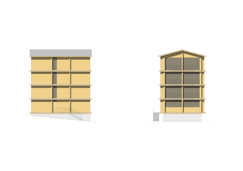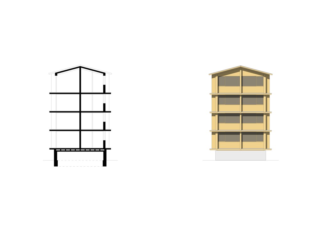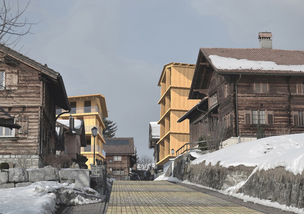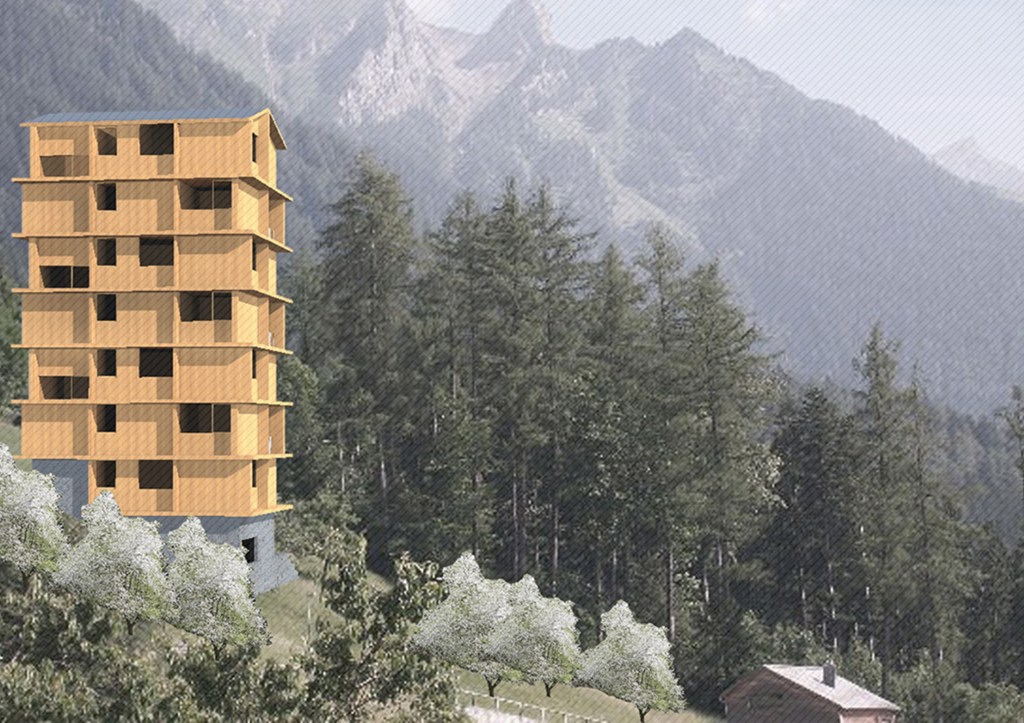 The plan proposed 4-storey high urban houses along the main street of the village and high-rise (7-storey) apartment buildings on the upper parts of Planken. The two types of houses (urban- and high-rise apartment buildings) are made by massive wood panels, which is a modern and local way to build in the Alps (innovation and tradition). The houses have a rigid spatial system, because building from wood have some limitation. The massive wood structure create rooms and there are no corridors in the apartments, rather spaces. Every space has its own function, which cannot be changed in the future. This structuralist way of thinking reflects to the feeling of the old alpine houses.