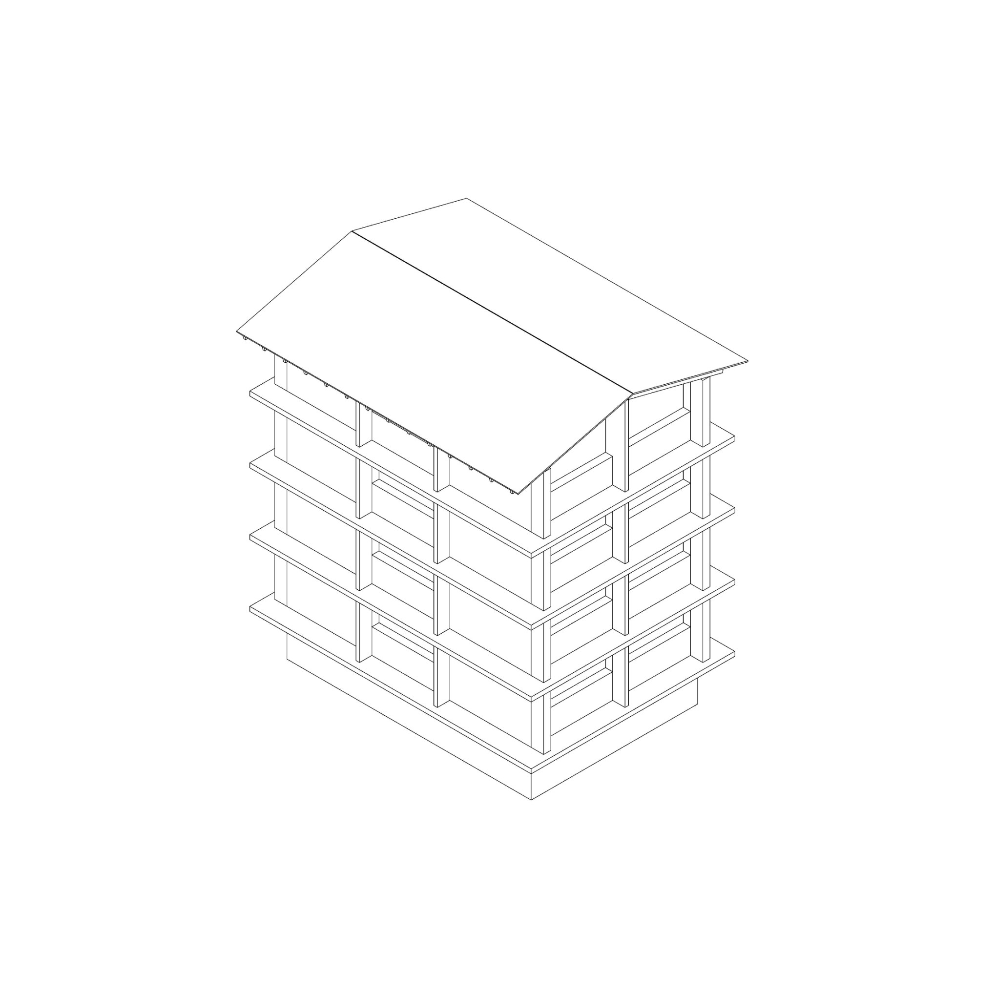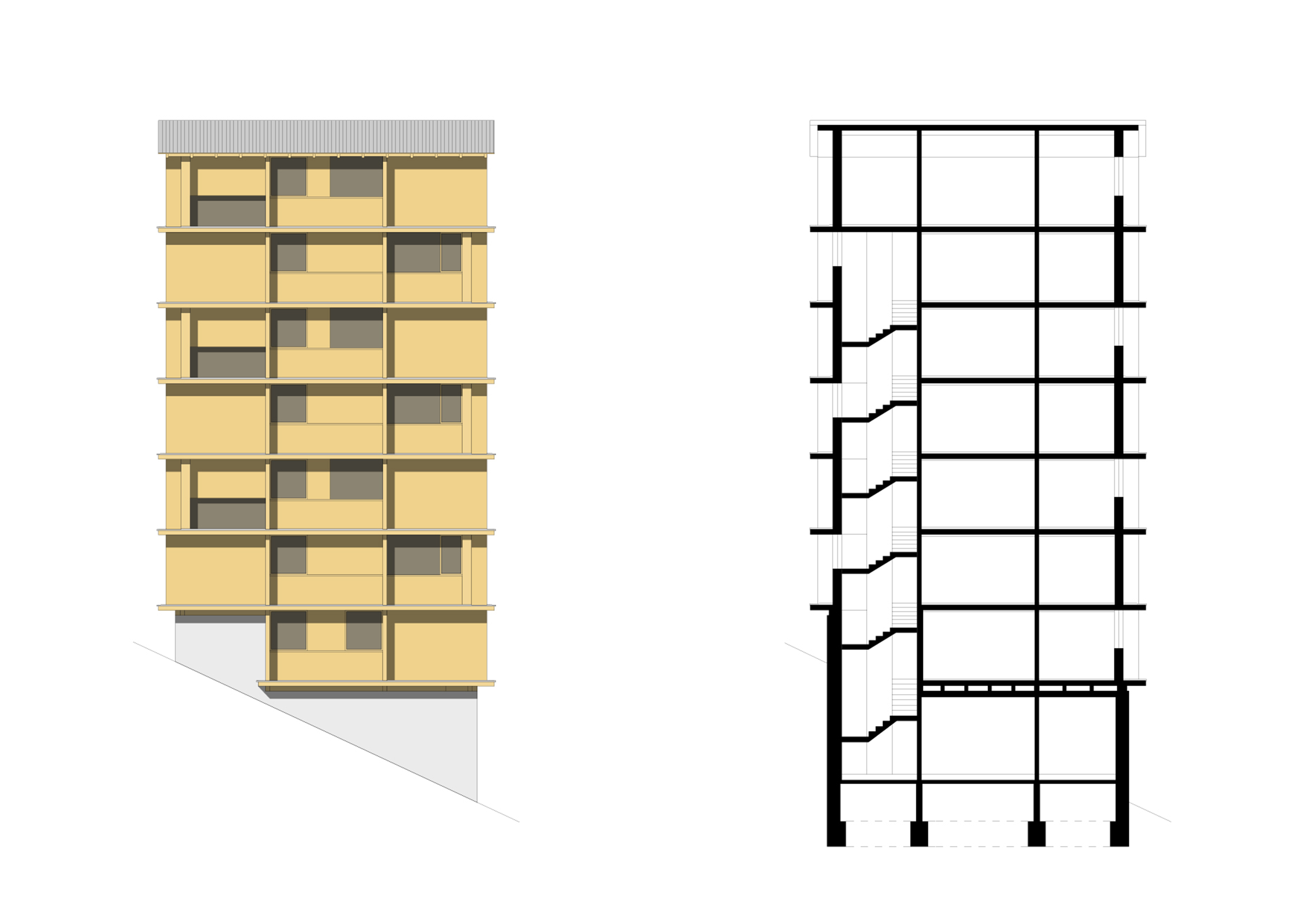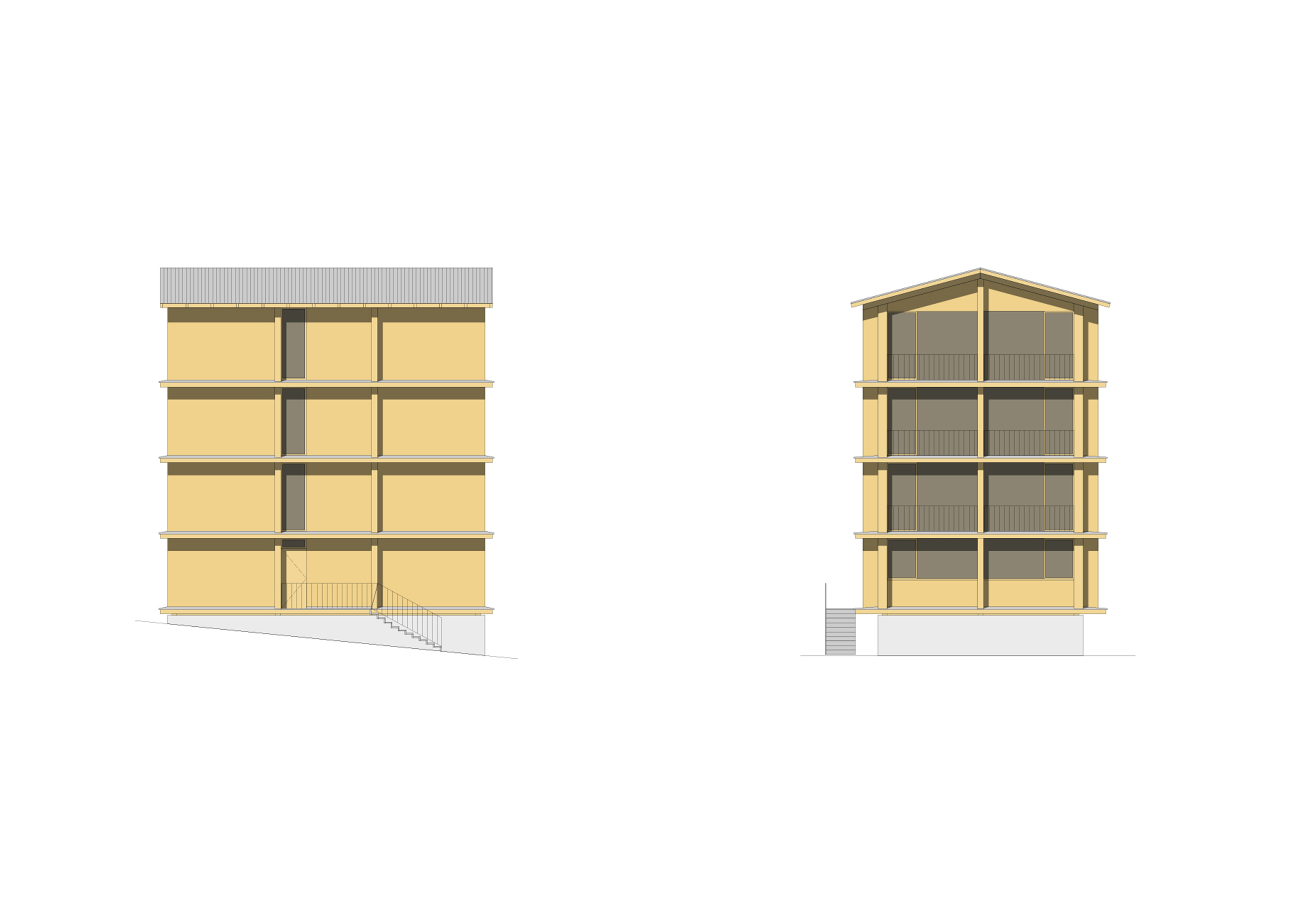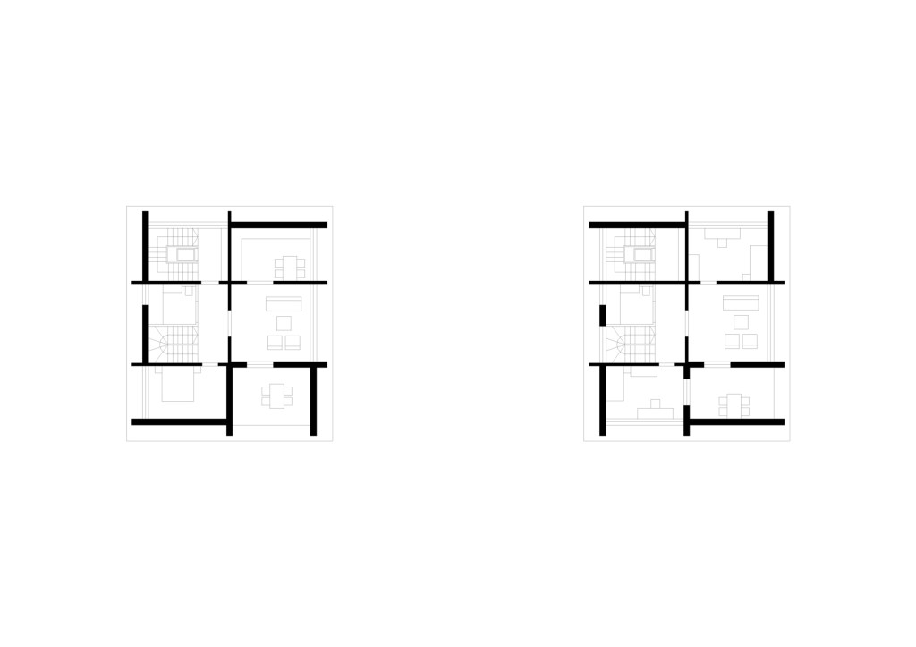 The plan proposed 4-storey high urban houses along the main street of the village and high-rise (7-storey) apartment buildings on the upper parts of Planken. The two types of houses (urban- and high-rise apartment buildings) are made by massive wood panels, which is a modern and local way to build in the Alps (innovation and tradition). The houses have a rigid spatial system, because building from wood have some limitation. The massive wood structure create rooms and there are no corridors in the apartments, rather spaces. Every space has its own function, which cannot be changed in the future. This structuralist way of thinking reflects to the feeling of the old alpine houses.