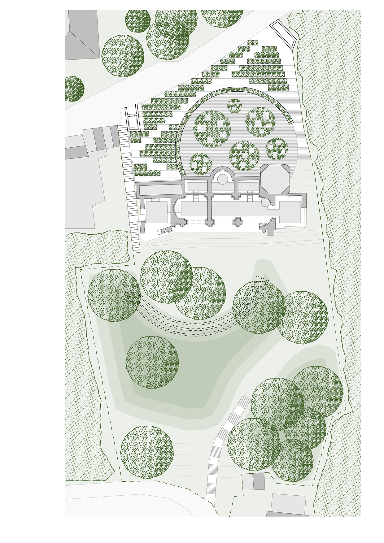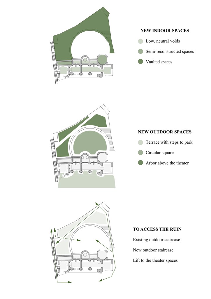 The area behind the ruin is currently the least quality green area in the park, therefore the location of volume the theater here is justified. In addition to the choice of location, it is also said that this point is the main access direction to the park and will be the gate of the park in the future. The area’s basically romantic garden character is preserved, and perhaps even strengthened in some points. Above the abstract underground spaces of the theater, an arbor garden will be created, which, together with the park, primarily serves the relaxation of the local residents. The existing steps to the south of the ruin are remained and would continue to lead to the same place as before: to the foot of the ruin, to the park. A new steps were placed to the north of the ruin, and they are also volume of the theater, which reveal the large, circular space in front of the theater, but also lead to the green area. The atmosphere of the circular square in front of the theater is half paved and half green: the square becomes the center of the place instead of the fact that the ruin turns its back on it without any openings. The large empty wall of the ruin is always visible from the new interior and exterior spaces of the building: there is a continuous communication with the Nymphaeum from the new spaces.