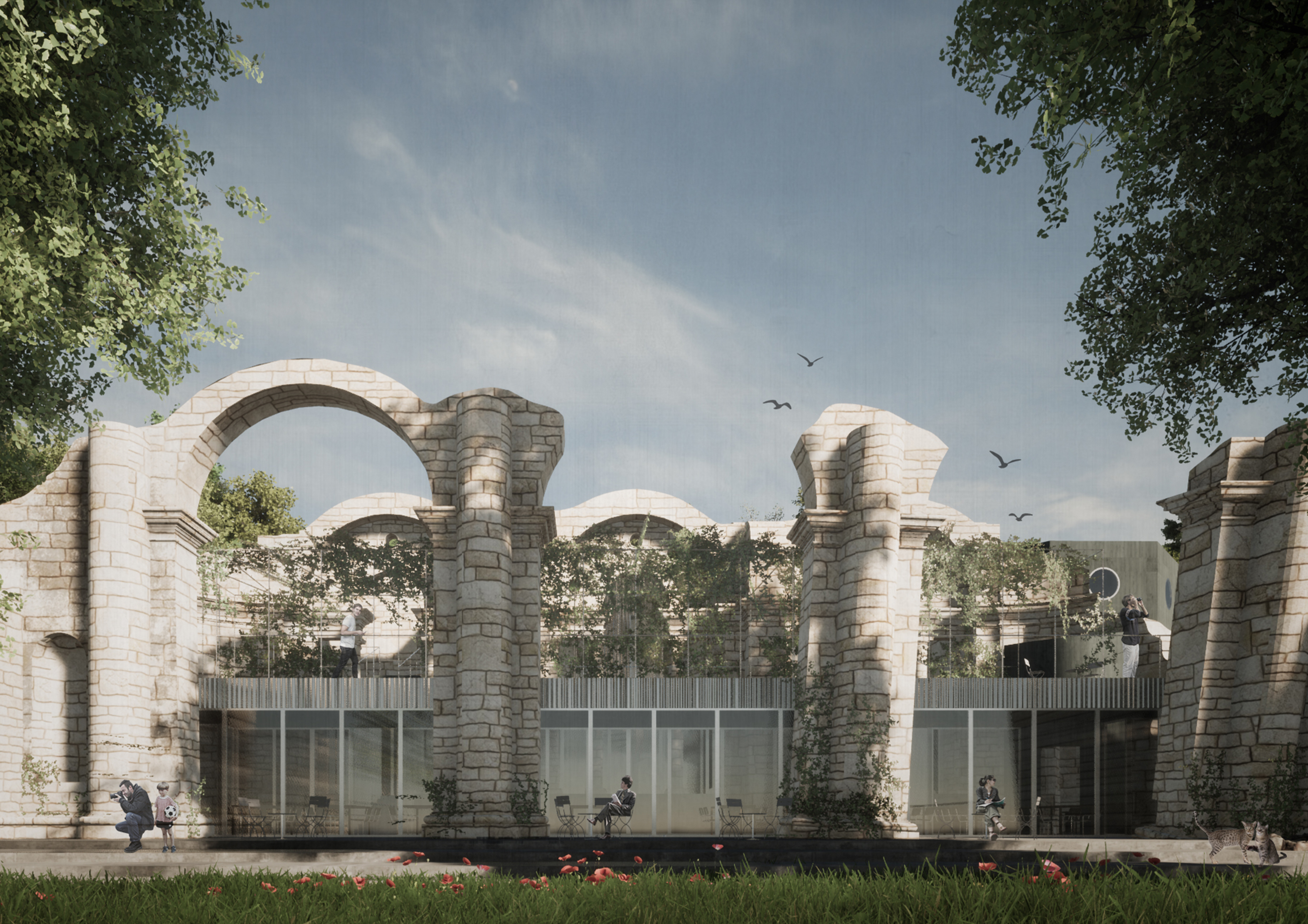 The functional program of the building was based on the principle that the ruin should be kept in its original form, its current state should be conserved and completed where it is possible. Both the interior and exterior spaces of the ruin can be easily explored, as a public function has been included that is available to both theater and park visitors: a restaurant and bar which bring life to the park.