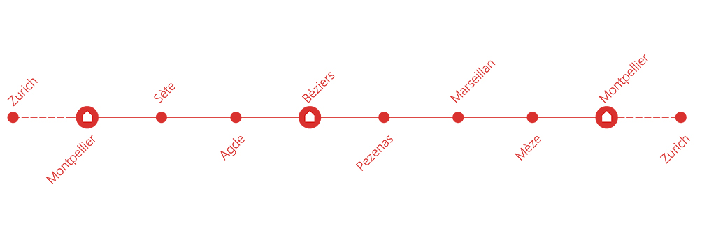 The trip starts at Zurich Main Station early in the morning. Go to Montpellier with two changes in Basel [CH] and Mulhouse [F]. You arrives to Montpellier after noon, so you can start with a lunch in one of the many restaurants in the city. Take a walk in the old town: Place de la Comedie, Opera House, Esplanade Charles-de-Gaulle, Rue Foch, Aqueduc Saint-Clément. From the Promenade du Peyrou you can look around and see the South French landscape. I can recommend also to take a walk in Jardin des plantes (Botanical Garden), it was be one of my favorite places in the city.