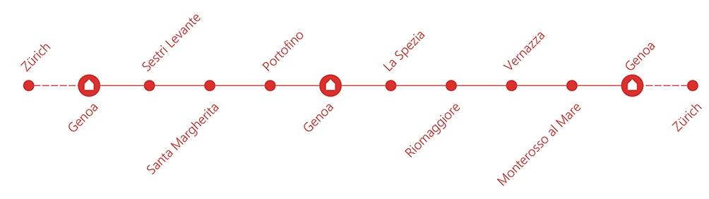 The trip starts at Zurich Main Station early in the morning and you can arrive to Genoa around lunch time (with one change in Milan). Take a walk in the city: you can see a lot of steps and may stange situations, because Genoa is a city with many level difference: the city lives in more vertical levels and this makes Genoa special. There is also many different quarters: you can find middle age narrow steets almost without natural light, because the houses are high, and there are parts of the city with big palaces standing in beautiful gardens. Some places that I like: Scalinata delle Tre Caravelle, Carignano Quarter with the Basilica di Santa Maria Assunta, Cattedrale di San Lorenzo, Piazza De Ferrari (photo) (here stands the famous Teatro Carlo Felice, which was reconstructed by Also Rossi), Galleria Giuseppe Mazzini, Edoardo Chiossone Museum of Oriental Art (from the terrace there is a nice view to the city).