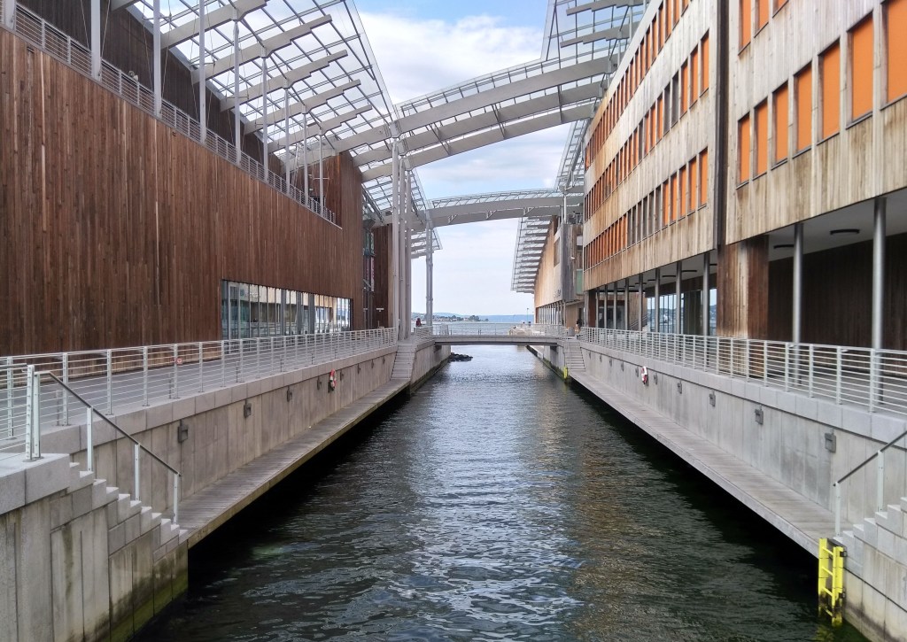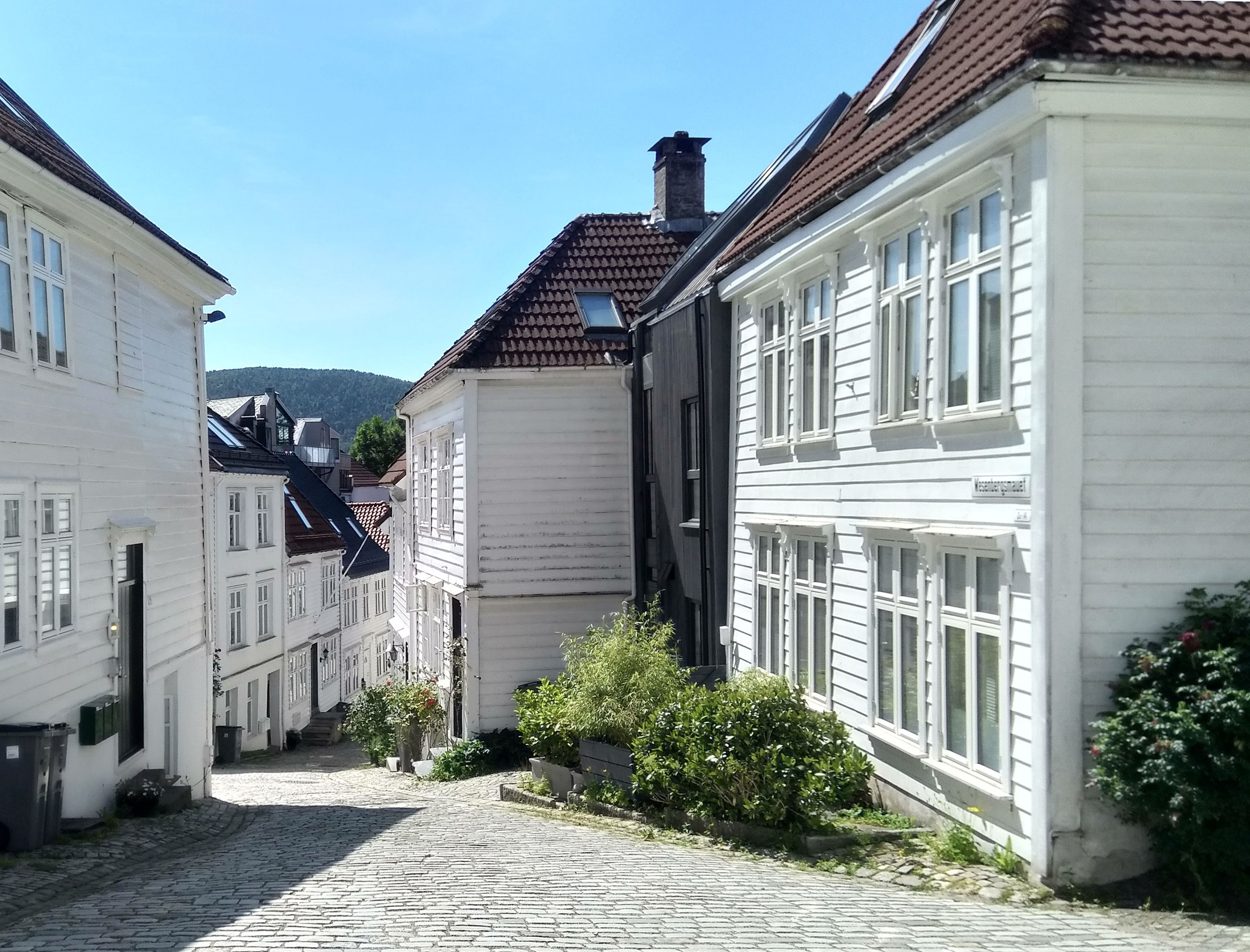 (We had bad weather on the day before so we started the day in Borgund.) Start the day in a new and trendy bakery in Lærdal: Fredag & Fretland Bakeri. Go throught the LærdalTunnel, which is the longest car tunnels of the world (24 km). On the other side of the tunnel you should drive up to the Stegastein (tip: the road is steep and narrow and there are many cars on it, so you should be careful). From this new viewing platform you can see the Aurlandfjord from above. Go further to Flåm, if you have time – this place is famous, but actually I have not seen any intersting things, just many people, who were waiting for the cuise ship… Drive to the Nærøyfjord (photo – from the town of Gudvangen), which is a UNESCO world heritage site, and may one of the most beautiful fjords of Norway. And now you can take a look to the valley from above: the terrace of the Stalheim Hotel is open for the public. The road between Stalheim and Oslo is very nice: you can see lakes, forests, fjords and waterfall. I recommend you to take some time by the Tvindefossen waterfall. You arrive to Bergen in the evening and for architects it almost mandatory to have an accommodation in the Stølen district. This place is famous from its white wooden houses and by almost every entrance roses are growing.