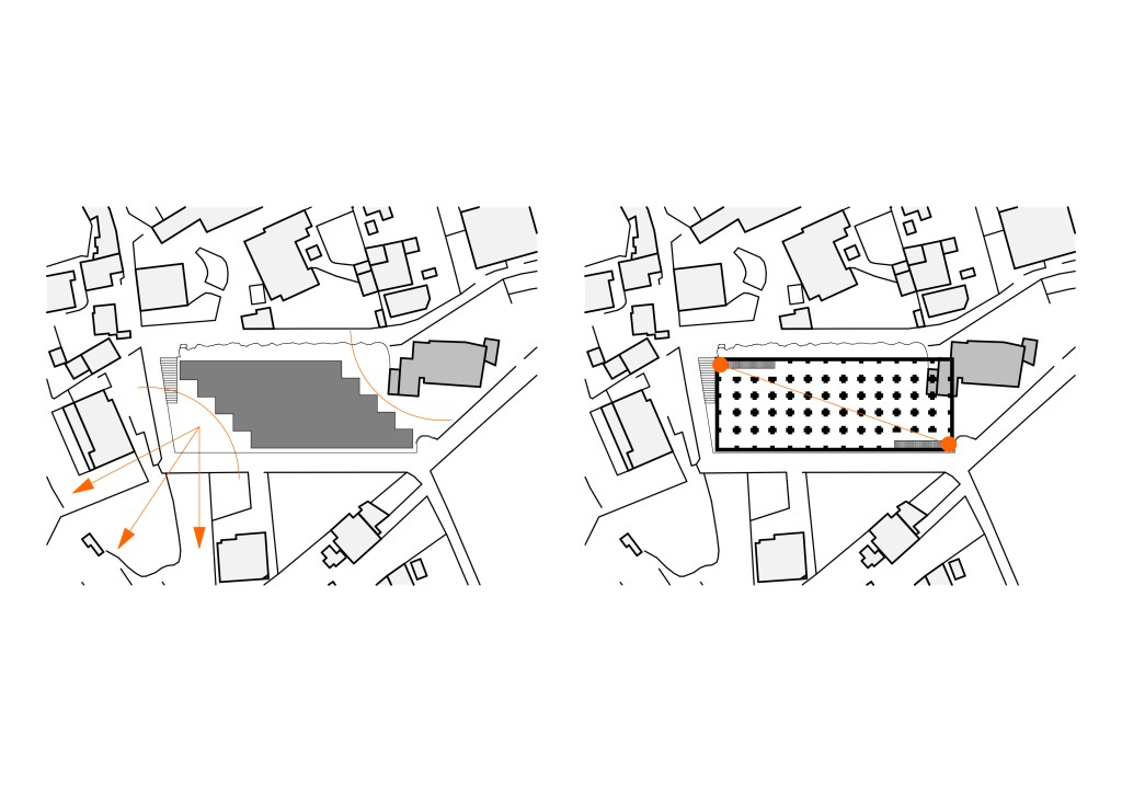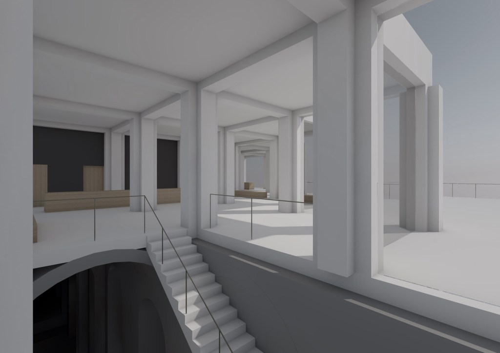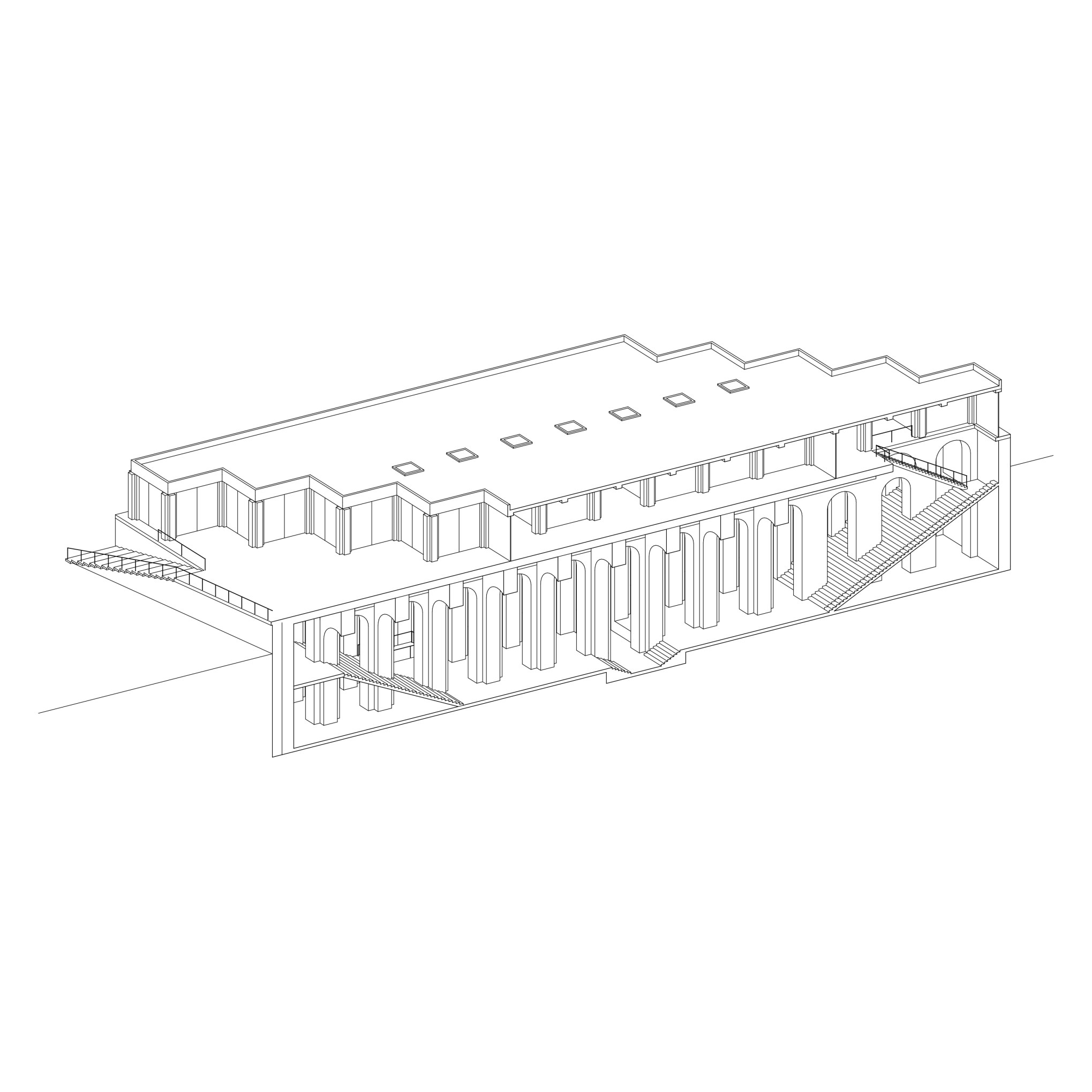 The diagonal form of the extension mirrors the main idea of the proposal: to connect the two old stairs with each other. Because of this spacial system the visitors go through the book shop at the end of the exhibition. The proposal wants to build further the old stairs of the roman cistern. This solution protects the amazing space of the reservoir and gives new perspectives to discover the space. Under the huge stairs there are some storage spaces.