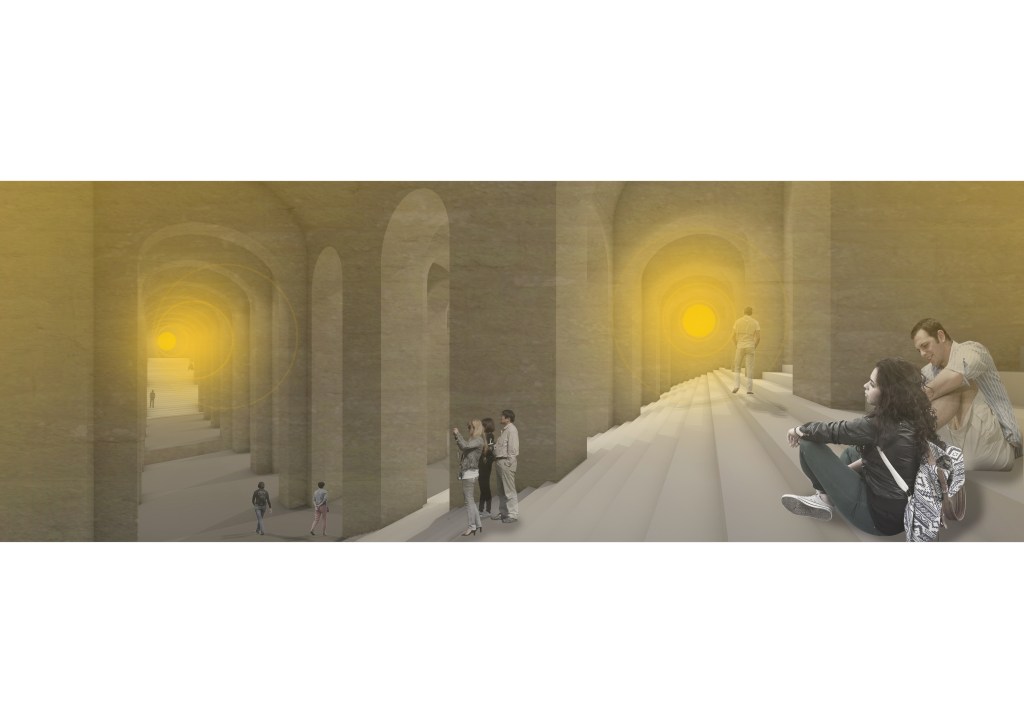Thanks to the new stairs, it is possible to see the space from another perspective. In this museum the new movements of the contemporary art should be presented, which can strengthen the spacial perception of the roman cistern, too. This proposal shows a possiblilty, how can we imagine an exhibition as the “Weather-project” of the Islandic artist Olafur Eliasson, which he performed with light and fog.