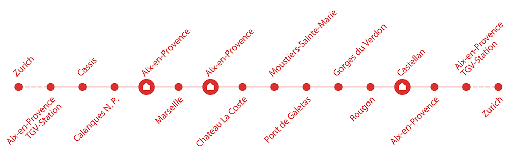 The tour starts at Zurich Main Station and goes to Aix-en-Provence TGV-Station [you have to change the train in Geneva [CH]. Rent a car and go to Cassis, a small fishermen’s town by the sea. [Tip: eat some sea food.] Cassis is also the starting point to discover the Calanques Natinal Park. These are the Fjords of the Mediterranean sea [photo]. From Cassis you can reach easily three Calanques: Calanque de Port-Miou, Calanque de Port Pin and Calanque d’en Vau. [Tip: park with the car in Cassis somewhere on the Avenue des Calanques or direct by the Port-Miou. Take sport shoes or hiking shoes. The route is well developed, but walking on the cliffs is sometimes dangerous, because there are slippy.] In the evening drive to Aix-en-Provence and enjoy the fantastic gastronomy of the town.