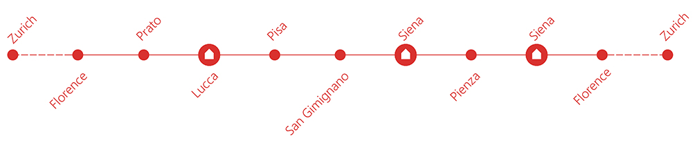 The trip starts at Zurich Main Station early in the morning. Go to Florence Santa Maria Novella train station with one change in Milan [I]. Rent a car there and drive to Prato, where you can find the famous church Santa Maria delle Carceri [completed in 1495] by Giuliano da Sangallo. It is one of the most important renaissance churches in the world. Go further to Lucca, which is a nice Tuscan town with an eye-catching, ellipse-shaped main square. It is worth to have an accomodation in an old pallazzo house with a courtyard in the middle.